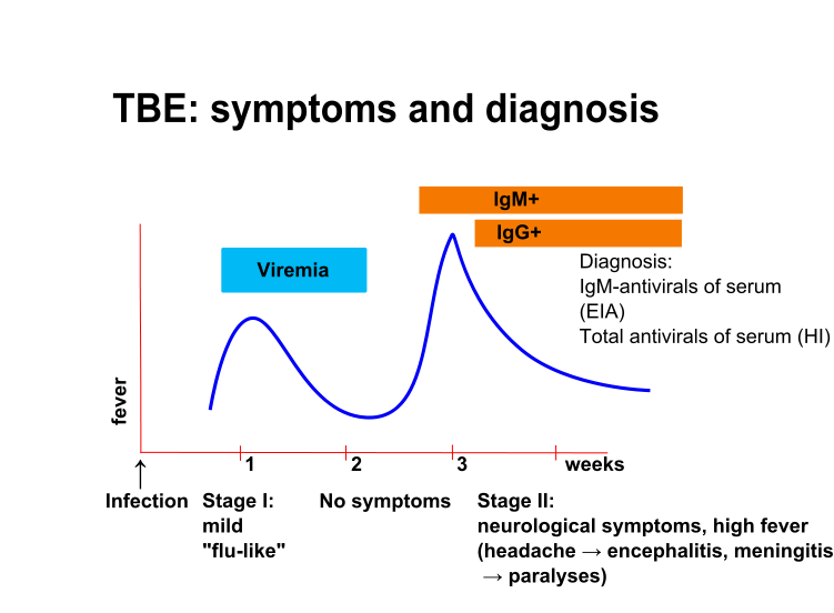 Generalmente el curso de esta enfermedad es bifásico, con una primera fase prodrómica de pocos días de duración y similar a un síndrome gripal. Esta fase se sigue de un periodo afebril y en un 10-15 % de los casos aparecerá la segunda fase, un nuevo cuadro febril pero acompañado de cefalea intensa, nauseas, vómitos y síntomas meníngeos que puede evolucionar al coma y a la muerte o dejar secuelas neurológicas permanentes tras la recuperación.