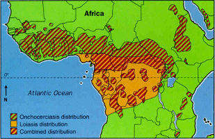 Especialmente afectadas están Nigeria y Camerún, sobre todo sus zonas boscosas. En la cuenca del río Congo (República Centroafricana, República del Congo y República Democrática del Congo) hasta el 90 % de la población en algunas aldeas está infectada.
