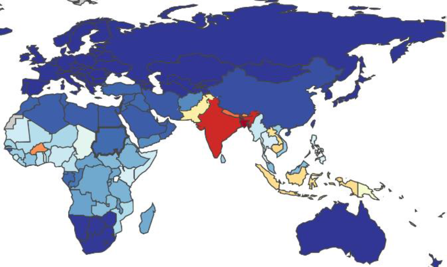 En los países menos desarrollados la magnitud real es desconocida pero sigue siendo un problema importante de salud, como es el caso de diversos países de la antigua URSS, del Sureste de Asia, de África y de Sudamérica. Según estimaciones de la OMS se producen en el mundo unos 21 millones de casos/año, con entre un 1 y un 4% (200.000 a 600.000) de casos fatales. Cabe destacar que el 90% de los casos letales se producen en Asia y que tres países concretos de esta región (India, Pakistán y Bangladesh) acumulan el 85% de los casos mundiales. Debe tenerse en cuenta que los casos leves y tratados con antibióticos sin diagnóstico etiológico, no son notificados y por tanto la incidencia está infraestimada, sobre todo en el caso de África. En este continente el último gran broteocurrió en 2005, cuando se notificaron 42.564 casos en la República Democrática del Congo. Mucho más reciente, en 2011-2012, se ha notificado un brote en Zimbawe, con unos 4.000 casos sospechosos (y más de 1.800 oficialmente notificados) de esta enfermedad.